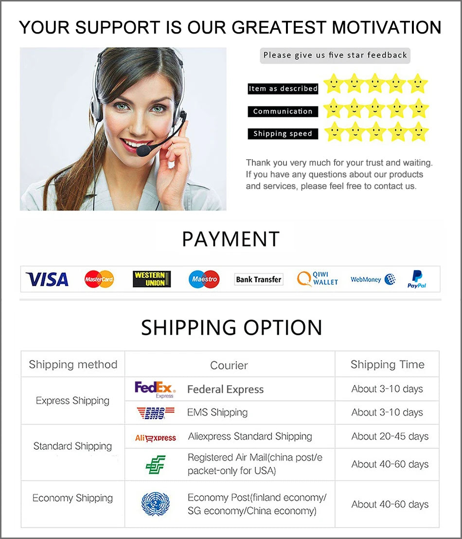 Hoping you can give us a good feedback!Your feedback is very important to our business development.